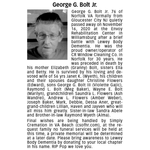 Janet Bolt and the family of George Bolt, may we offer our sincere condolences for the loss of a good man who will be missed. May good memories stay with you of a loving husband, father and grandfather.